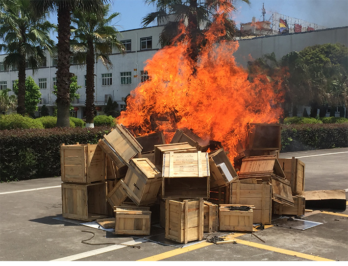 2016年6月22日,防治小組成員準(zhǔn)備了汽油、滅火器及水管,疏散了部分車(chē)輛和無(wú)關(guān)人員,在確保周邊環(huán)境安全后,將百余件松木箱至廠區(qū)空曠處進(jìn)行焚燒銷(xiāo)毀。待大火撲滅后,小組成員上前查看,確保松木盡數(shù)化為灰燼。